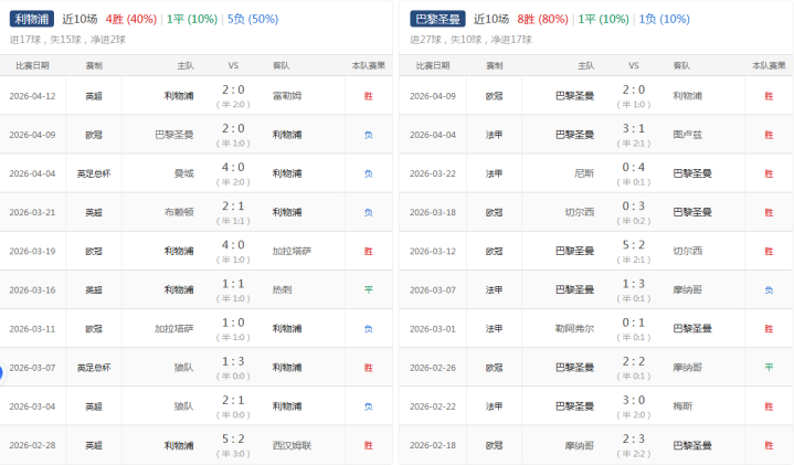 从数据基本面来看,两队近期状态呈现天壤之别。巴黎圣日耳曼近 10 场比赛豪取 8 胜 1 平 1 负,欧冠赛场更是保持 8 场不败的统治级表现,近 6 场淘汰赛狂轰 15 球,场均进球超 2.5 个,攻防两端数据堪称恐怖;反观利物浦,近 10 场仅 4 胜 1 平 5 负,客场遭遇四连败,本赛季已输掉 16 场比赛,状态跌入谷底。更致命的是,利物浦遭遇严重伤病潮:阿利松、远藤航、布拉德利等 7 名核心球员伤缺,防线仅剩范戴克独撑,替补门将凯勒赫临危受命,欧冠经验几乎为零,残阵红军面临前所未有的考验。